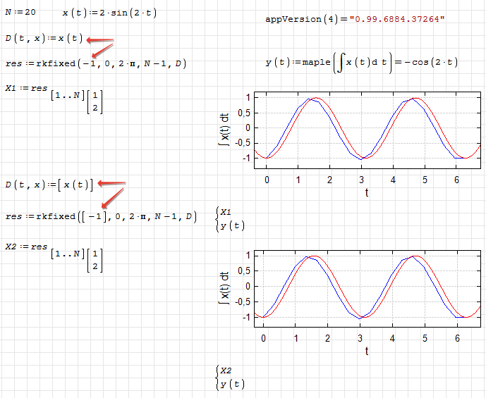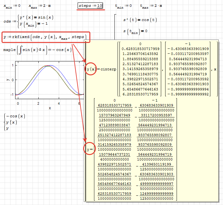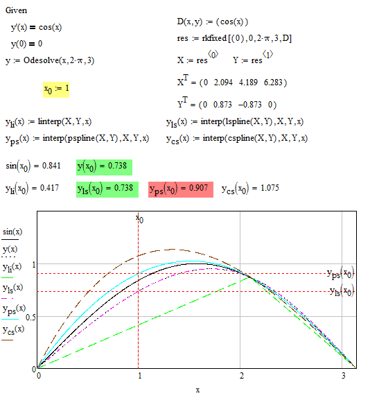 WroteOk, I found a bug in rkfixed() and finally figured out the difference between interpolation functions. In the picture below, I repeated part of the calculations from Mathcad. As you can see, to interpolate the numerical solution of the ODE, a cubic spline is used, linear at the end points.