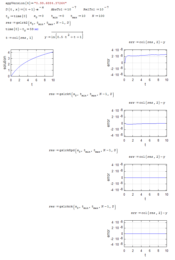 gslrk4(4) - (ode,y(x),xmax,steps) explicit 4th order (classical) Runge-Kutta. Error estimation is carried out by the step doubling method.