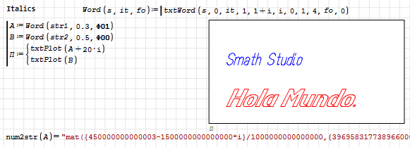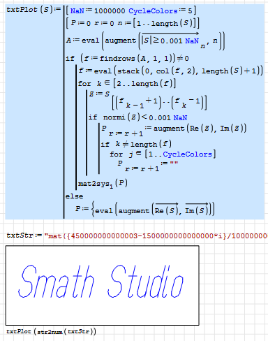 With this for include vectorial text in a graphic, there is no need to include the source in the document, with the fonts definitions and procedures to draw them; just a string and an auxiliary function, necessary because (I insist) SMath does not have NaN, because if it had, the function would not be necessary.