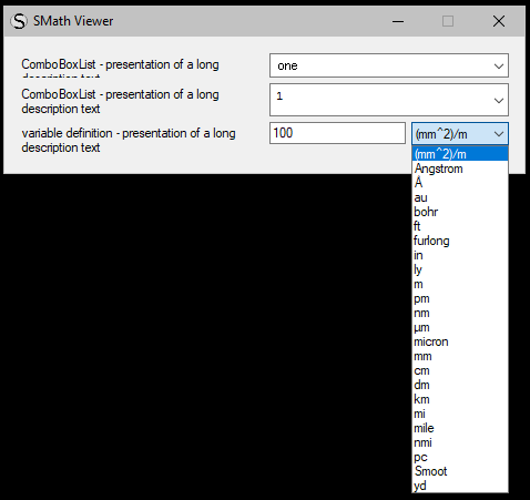 WroteWroteThe first one probably does not relate to the SMath Viewer itself, but the ComboBoxList extension. The longer description of the list does not fit into the window, making it unreadable (as shown below). This happens when the list contains text elements. Working with numbers does not cause this problem.