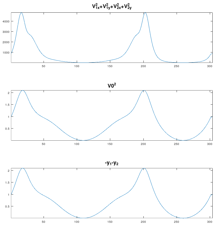 [RUS]Очевидно, что для введенной координаты V0 не выполняется соотношение V0^2=V1x^2+V1y^2+V2x^2+V2y^2. Ниже я привожу графики суммы квадратов скоростей точек 1,2 полученных численно, последнее уравнение делю на две части, которые равны друг другу[/RUS]