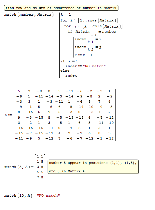 Hello, I'm searching for some function like match(z, A)(Looks in a vector or matrix, A, for a given value, z, and returns the index (indices) of its positions in A) in Mathcad.