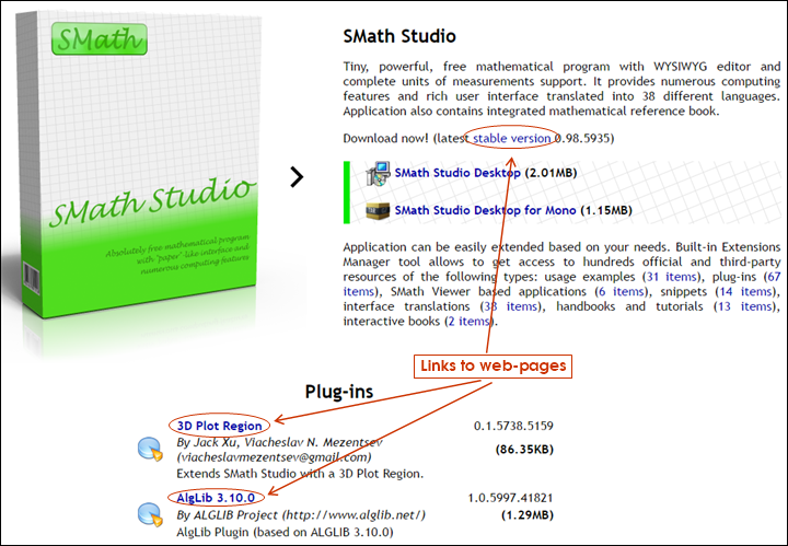Idea is simple - every plug-in or example, handbook, tutorial or SMath Studio itself are products. In the scope of the project every such item must have its own web-page with all related information: full description, screenshots, links to related pages in Internet, ratings and etc.