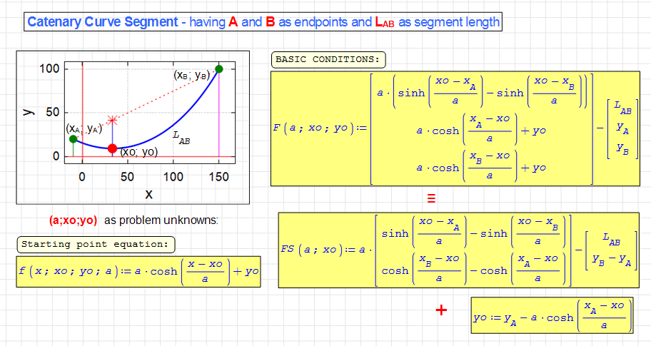In the classical cable’s analysis as in our present exchanges, the cable is well defined with 3 parameters. In my other developments, I use these 3 parameters: H = xB-xA; V = yB-yA; LAB (the developed cable length). More than that, the problem can be simplified by using only 2 input information: tg_gamma = V/H; L = sqr(H2+V2)/ LAB. With a totally different approach (not yet published), I reduce these 3 parameters to only 2 adimensional parameters and the cosh(x) function. The results are totally identical to what we obtained here. More than that, the mathematical solution can be reduced to 2 separate equations.Some similar solutions (less cleaners then mine