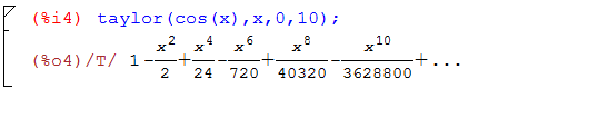 [MATH=eng]Maxima(taylor(g(x),x,0,10))=1-{x^2}/2+{x^4}/24-{x^6}/720+{x^8}/40320-{x^10}/3628800[/MATH]
