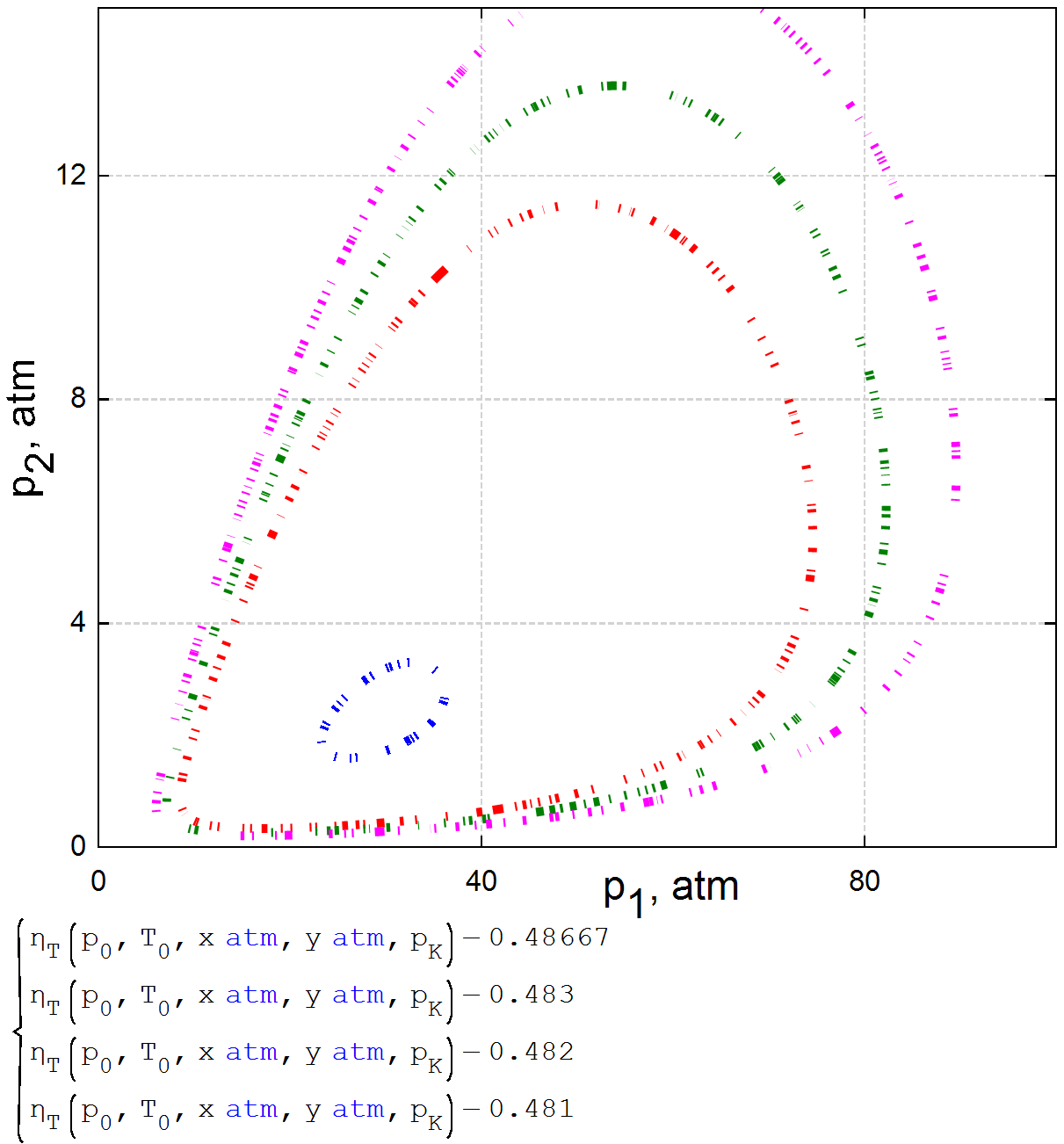 The graph you've provided seems to show a relationship between two pressures 𝑝1and 𝑝2, with annotations related to efficiency calculations.