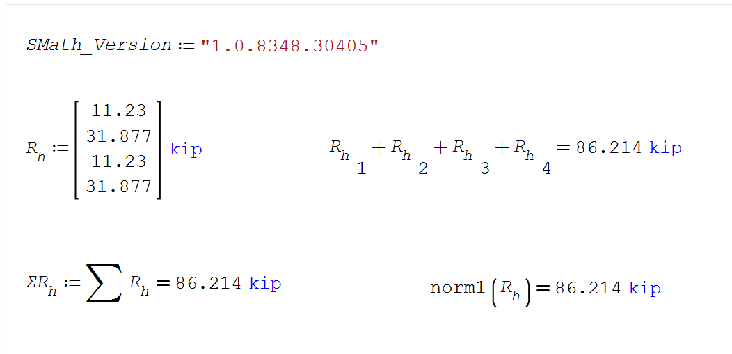 Am I missing something here? It seems that the sum(1) function that's supposed to provide the sum of the elements of a vector/matrix is coming up with an error in the basic summation. In the screenshot attached, the sum(1) function totals 87.288 kips for a 4 element single column matrix that adds up to 86.215 kips by hand on a calculator, by adding the elements individually in SMath, and by an L1 norm function. It's over 1 kip different, so it shouldn't be rounding in any way. Is there something different about the sum(1) function that would cause it to come up with a different answer, or is this a bug?