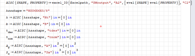 WroteThe excel_IO appears not to be working anymore as part of a custom function. It was working previously on my computer, but with one of the upgrades to SmathStudio it has stopped working. When the excel_IO is used as the right part of a custom function, the variables with equal signs get placed in the excel worksheet cells instead of the values of the variables. See the two screen shots below from the Steel Properties Look-up.sm and corresponding excel file. The excel_IO otherwise appears to work but not as right part of custom function with variable input.