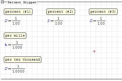 BTW I hope that hereafter the standard % sign will be unlocked by Andrey as an official unit. If this is not possible the alternative could be to have a "symbolical" function perc(1) for the LHS (like sum(), diff(), int(), etc..., where the function is converted as a drawn symbol with a placeholder - like in the picture attached below), and a new "percentual" item in the "fractions" context menu for the RHS (something auspicable also for the imaginary form: [MATH eng]e^{i*θ}[/MATH])