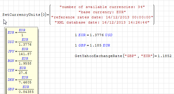 - SetCurrencyUnits(1), SetCurrencyUnits(2): extends SMath Studio with currency units. When an internet connection is available, exchange rates are kept updated using the ECB reference rates (internet connection not required but useful);Quote