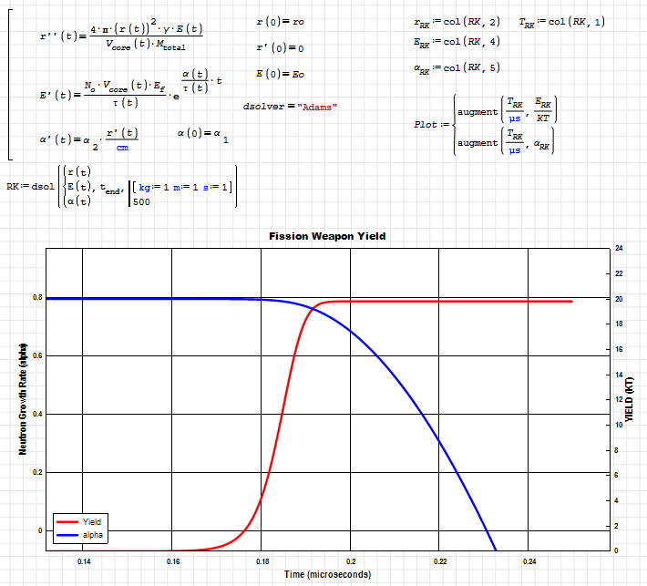 Increasing the core expansion steps in the SMATH version reduces the accuracy of the linear fit to alpha and lambda; this does not happen in my MATHCAD version. If you look at the solve function that I use in SMATH for the fit, there is probably a better fit function in SMATH, but I was not very familiar with the fitting functions in SMATH when I developed this fission model. The complicated expression that obtains alpha comes from a solution of the neutron diffusion equation in spherical coordinates. In MATHCAD, I don't have to break up the f(alpha) transcendental equation into three components.