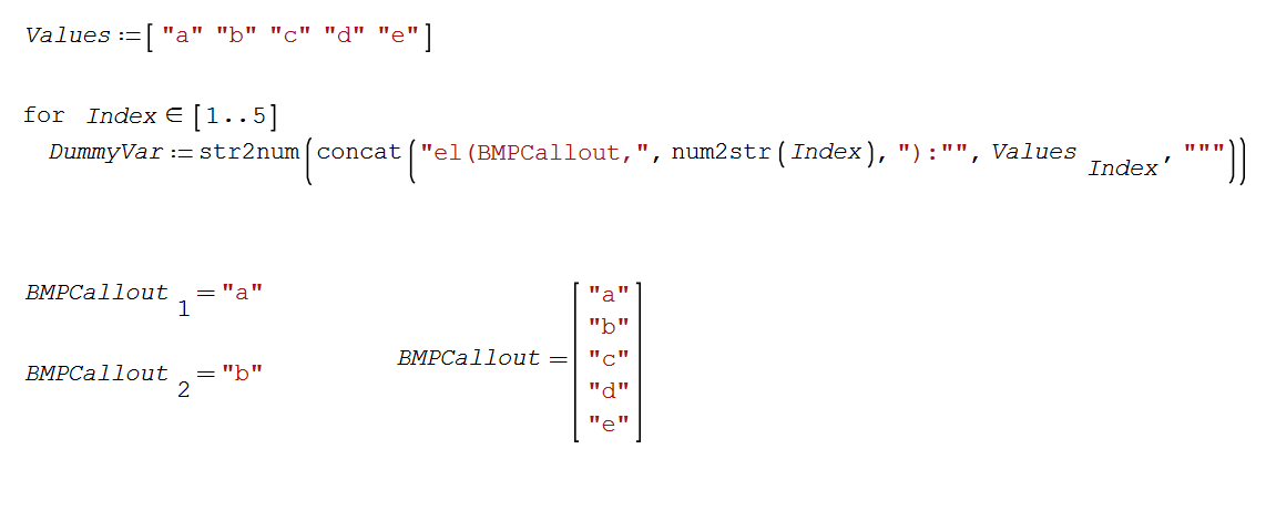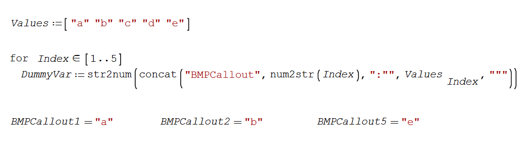 Moreover to tell the truth I have tried by myself to play with the concat and the str2num a num2str commands feeling that using these commands there was the possibility to solve the issues that I was facing ..but I started to think too much; the desire was to create a variable name (continuouly changing with an index) on the left side of an assignment expression and assign to it the content of an indexed variable . You see herewith the initial attempts but I give up quite soon seeing errors from Smath ( but obvously it was a fault of mine due to my ignorance )