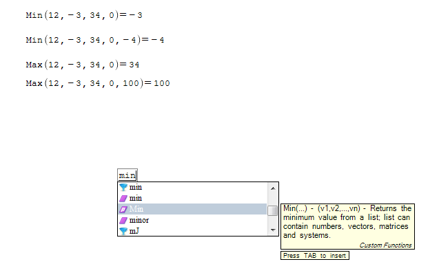 Min() and max() functions ought be overloaded to also accept multiple arguments (same functionality as Mathcad).Or provide an easy way to convert the old mathcad files.