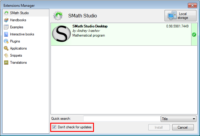 Go to Tools > Plugins... > SMath Studio and check Don't check for updates