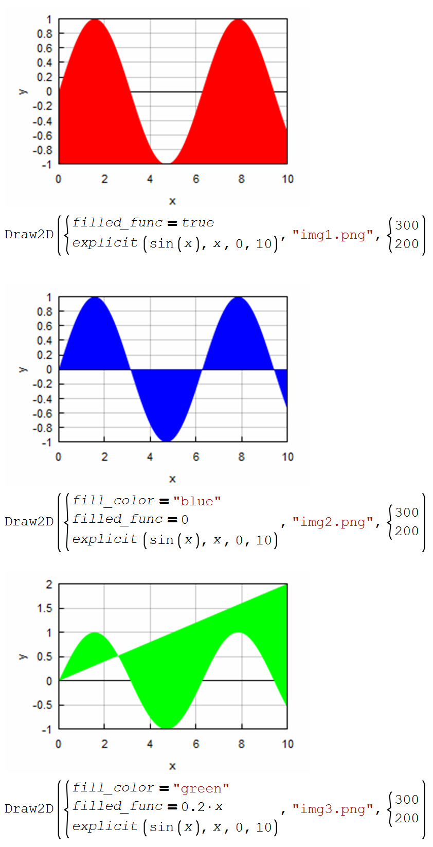 Wrote... In Maxima draw, there is an option filled_function, which allows to specify a second function which defines the other side of the fill. Simply saying 0 fills to the axis, some big value fills to the boundary (top or bottom). This is much like in the hatch snippet, where 2 functions are specified.