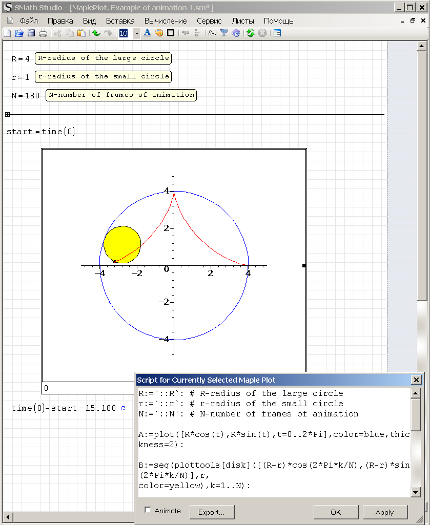 (R-r)*sin(2*Pi*k/N)+r*sin(2*Pi*k/N-R*2*Pi*k/r/N)],r/15,color=red),k=1..N):