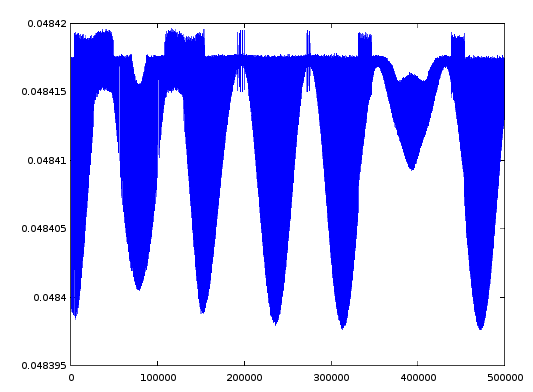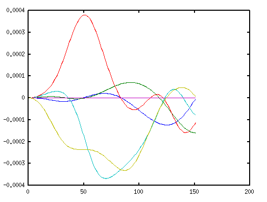 Теперь про гребенку. Я не понимал добавленного уравнения x1=0; или x6=0; Теперь я понял, что надо мысленно добавлять знак дифференциала, одно уравнение отдохнет, другое поработает и наоборот. Вот результаты при шаге 1е-3, 1е-4. Гребенка есть, пропорциональна шагу. Для определения точности сравним эти результаты. Теперь сделаем простую аппроксимацию, уменьшим кол-во точек в 2 раза: xi=(xi+x(i+1))/2, уменьшим шаг теперь не на порядок а в 2 раза, опять сравним. Результаты отличаются на порядок гребенки нет.
