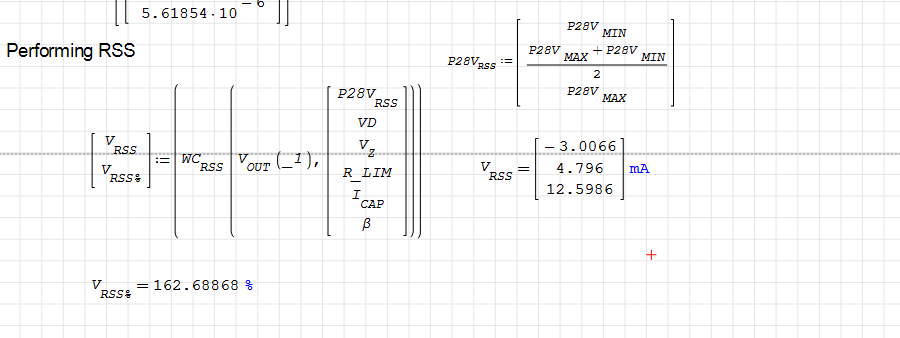 Another potential, and perhaps more meaningful alternative, is to fix the input voltage and perform the RSS analysis at each operating point of concern. Note that the minimum value calculated for P28V.MIN is still beyond the worst case value. So you also have to take that with a grain of salt.