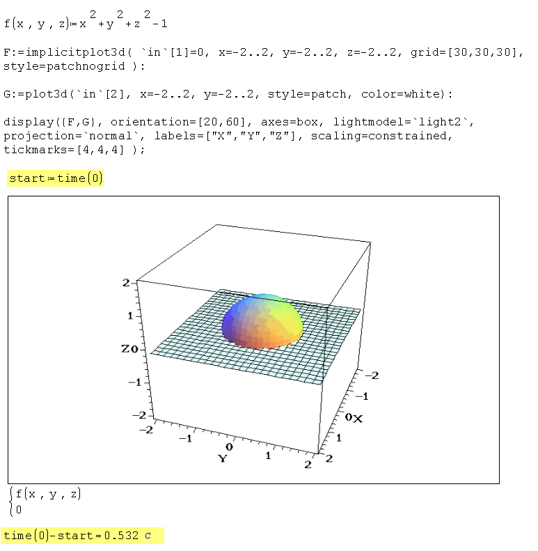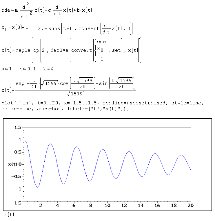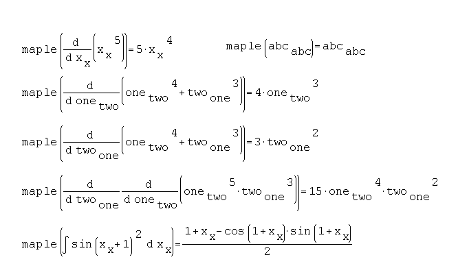 Использование: Внутри функции maple() вписываете команду Maple и нажимаете [Ctrl]+[.] (символьные вычисления/оптимизация). Параметрами могут быть переменные или функции, определённые в документе.
