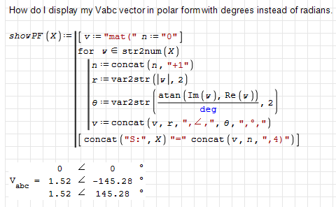 Thank you. That does not address formatting a vector result in polar with degrees (what I'm after) as best I can tell. I want to display my resulting vector in polar with degrees.