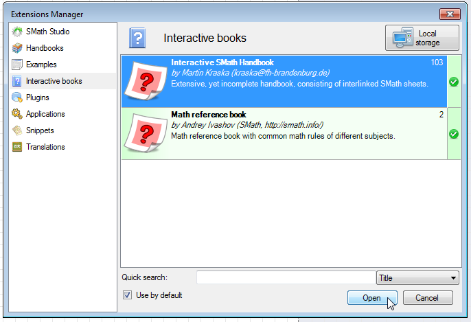 Больше информации можно найти в «Interactive SMath Handbook» из Martin Kraska ("Tools" > "Plugins" > "Interactive books")