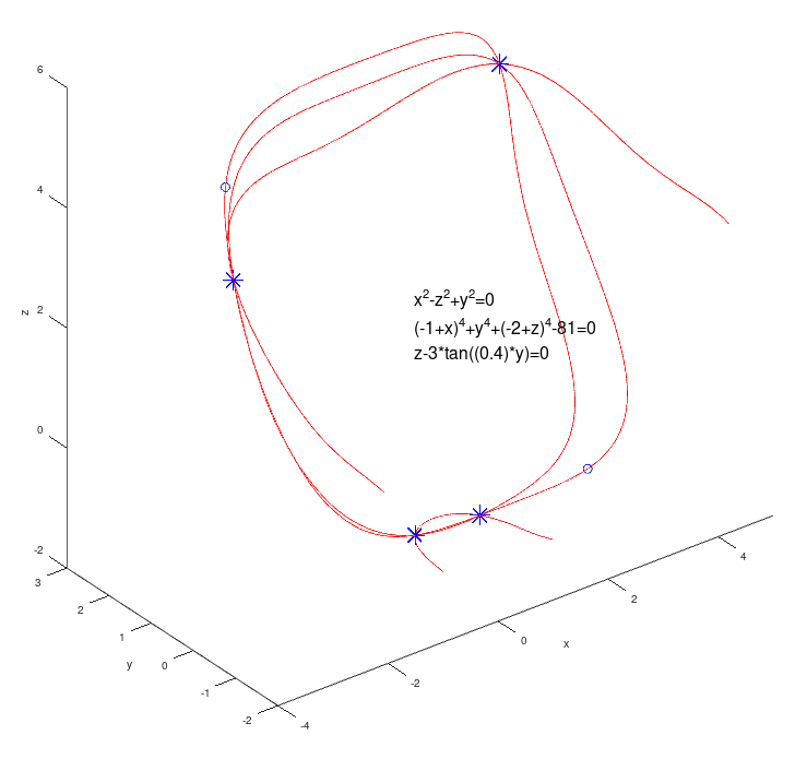 In the figure, the solutions are shown with an asterisk, the red curves are obtained when different initial conditions are given.