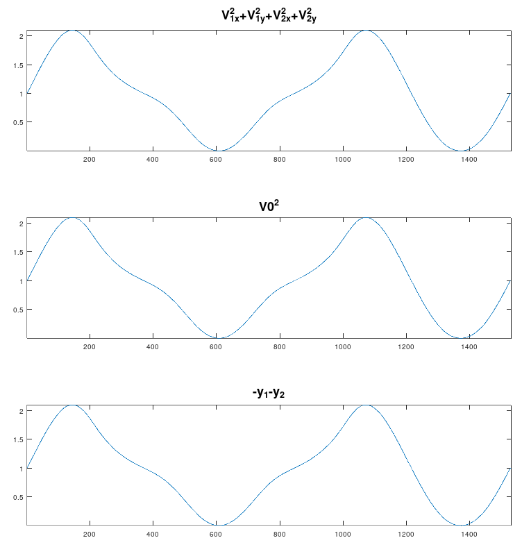 [RUS]Очевидно, что для введенной координаты V0 не выполняется соотношение V0^2=V1x^2+V1y^2+V2x^2+V2y^2. Ниже я привожу графики суммы квадратов скоростей точек 1,2 полученных численно, последнее уравнение делю на две части, которые равны друг другу[/RUS]