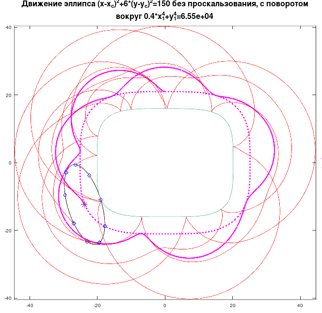 [ENG]IMovement of the ellipse without slippage with rotation relative to the ellipse. The animation is rough, the errors are large. I got an inaccurate solution from the system of de's, but a combined one (the sum of several movements)[/ENG]