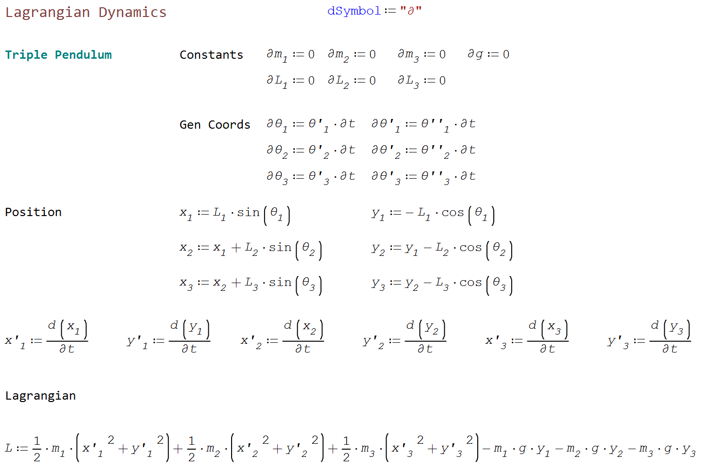 Hi. Using pure SMath code to deduce the equations of motion from the Lagrangian, with the functions in this post: https://smath.com/en-US/forum/topic/AeeMSM/Using-differentials.