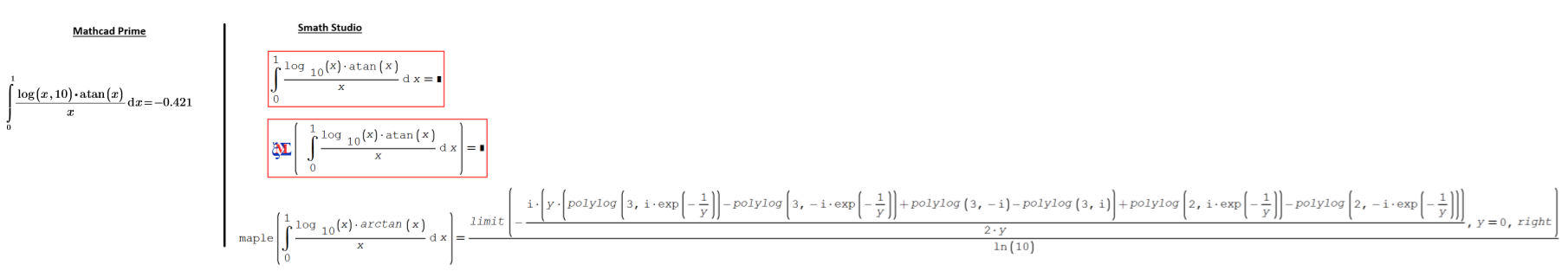 Форум SMath SMath Studio Questions Smath cananot solve this integral No4 while Mathcad Prime can 1 страниц (2 вхождений) Smath cananot solve this integral No4 while Mathcad Prime can - Сообщения К последнему сообщению #1 Опубликовано: 26.12.2024 03:12:08 Cornel 2 сообщений из 78 понравились пользователям. Группа: User Hi,Another integral which Smath cannot solve while Mathcad Prime can: #2 Опубликовано: 26.12.2024 05:24:00 Alvaro 1 081 сообщений из 1 754 понравились пользователям. Группа: User 1 страниц (2 вхождений) Новые сообщения Нет новых сообщений