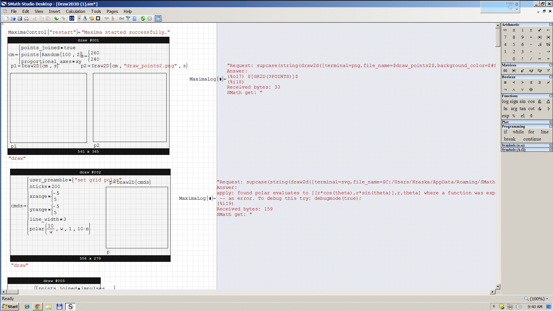 Just let us consider the Maxima Plugin as concept demonstration for how it would feel if SMath was a computer algebra system with a versatile plot function and a smart document concept (the last already given). For real life applications it is too slow (try plotting a matrix of more than some hundred data points with Draw2D).