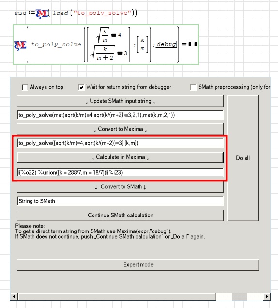 Also, solve() returns it result as a nested list of lists if there is more than one solution. Nested lists don't survive in SMath processing, so we had to replace the outer list by a matrix (row vector, for better optics).