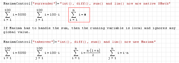 Maxima now does not overwrite the functions diff(), lim(), int() and sum(), because of the problems sum() and diff() can cause. Thus, we hope that Maxima now won't interfere with existing sheets as long as you do not ask explicitly by MaximaControl("takeover" ).