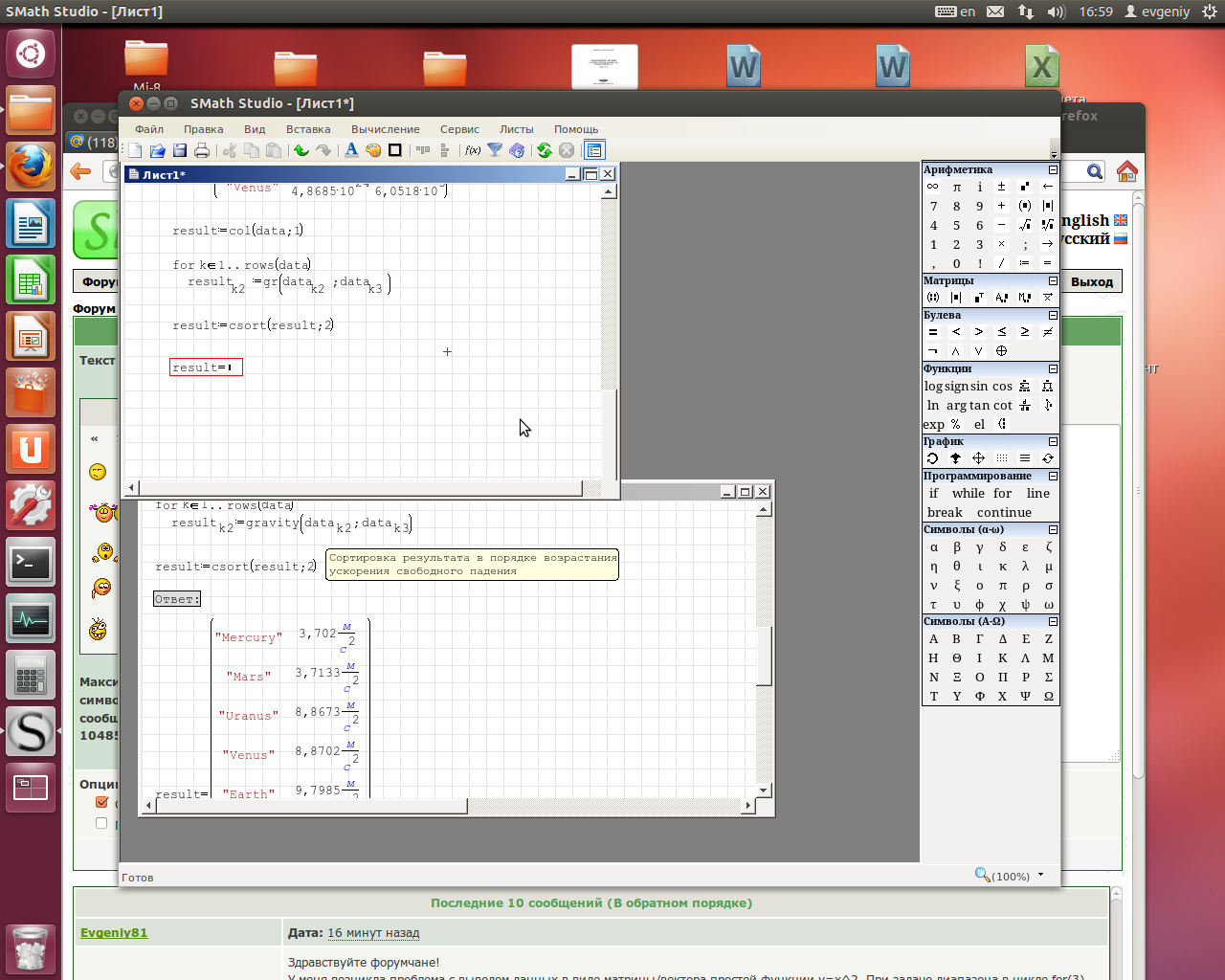 А как тодга вводить индекс через функцию el и что бы индекс выглядел как индекс? По сути я хочу получить на выходе вектор (или матрицу с одним столбцом) который можно будет использовать при построении графика. Входные данные также из себя представляют матрицу с одним столбцом. И как я понял переменная, к примеру result и переменная result с индексом I есть разные перемменные? Прикладываю пример который шел с программой по расчету гравитации и то что пытался сделать смотря на выше указанный пример.