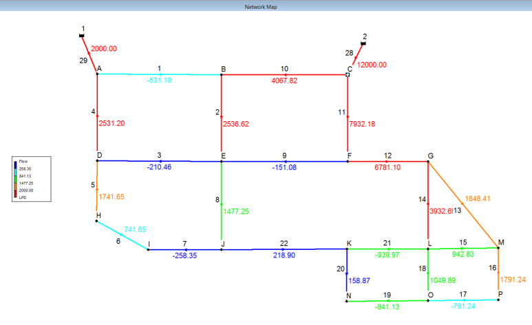 Essentially it is an overdetermined nonlinear pipe network with 22 variables {pipe flows) and 23 equations (16 Nodes + 7 Loops). The solution using SMath is based on a snippet using al_nleqsolve() posted by Viacheslav N. Mezentsev (uni) in SMath Forum.