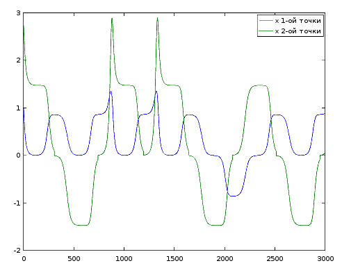 Если в octave взять н.к. в [0 sqrt(2) 0] он тоже зависает. Относительно легко избавился от пологового участка с условием log10(abs(x(:,1)))>-2), этих точек 28%. Сделал 3-ый вариант, с++ без зависания, координаты [1 1 1 2.7321 2.7321 2.7321], тут условие более сложное log10(abs(del_x))>log10(h), del_x=xi+1-xi, h- шаг, доля тоже 28%. На рисунке координаты по x c условием.