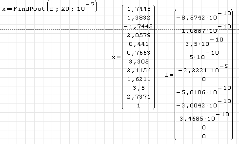 Я успользовал X0 из uni.sm как начальное приближение (второй аргумент функции FindRoot()). Как-то думал что Фридель имел это в виду, но потом заметил что Х0 уже решение. С другими хотя бы только чуть измененными значениями у меня также не получилось :-(