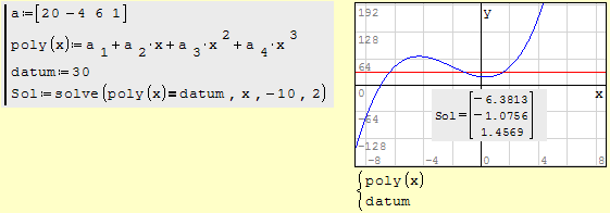 Hi, I have an polynomial equation (x^3 specifically) which I want to get the roots for. The roots are there if I plug in values from WolframAlpha (https://www.wolframalpha.com/input?i2d=true&i=-21.2Power%5Bx%2C3%5D%2B19707.8Power%5Bx%2C2%5D%2B6628342.5x-1125000000), I also checked on excel by changing x=? I found a root of x~128 but SMath won't do it.
