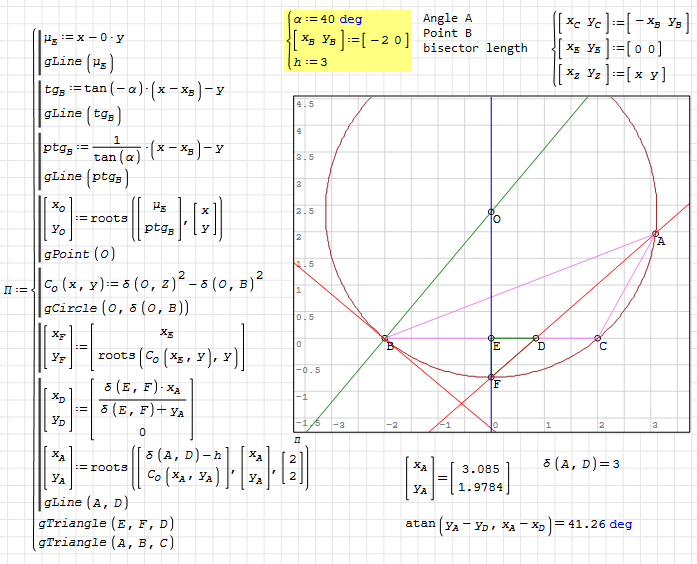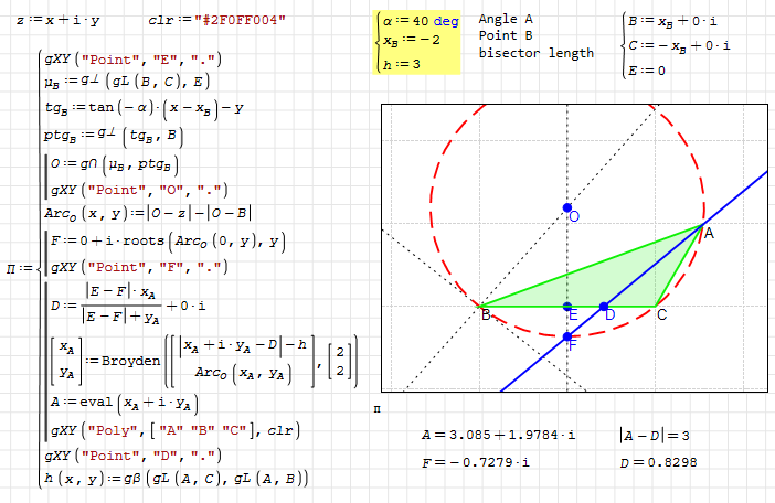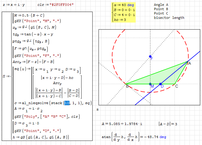 WroteI do not quite understand your reply on my problem (:triangle from angle A, its bisector h and its opposite side a). My intention was, that the value of h is given, but as far as I can see, you are using the intersection between a and h named D instead with a coordinate for D = 2.7+0*i. I can nowhere find a value for h, and likewise I do not see a calculation of the coordinate for D, so it seems to me, that it is the coordinates for D which you are taking for given in your solution.