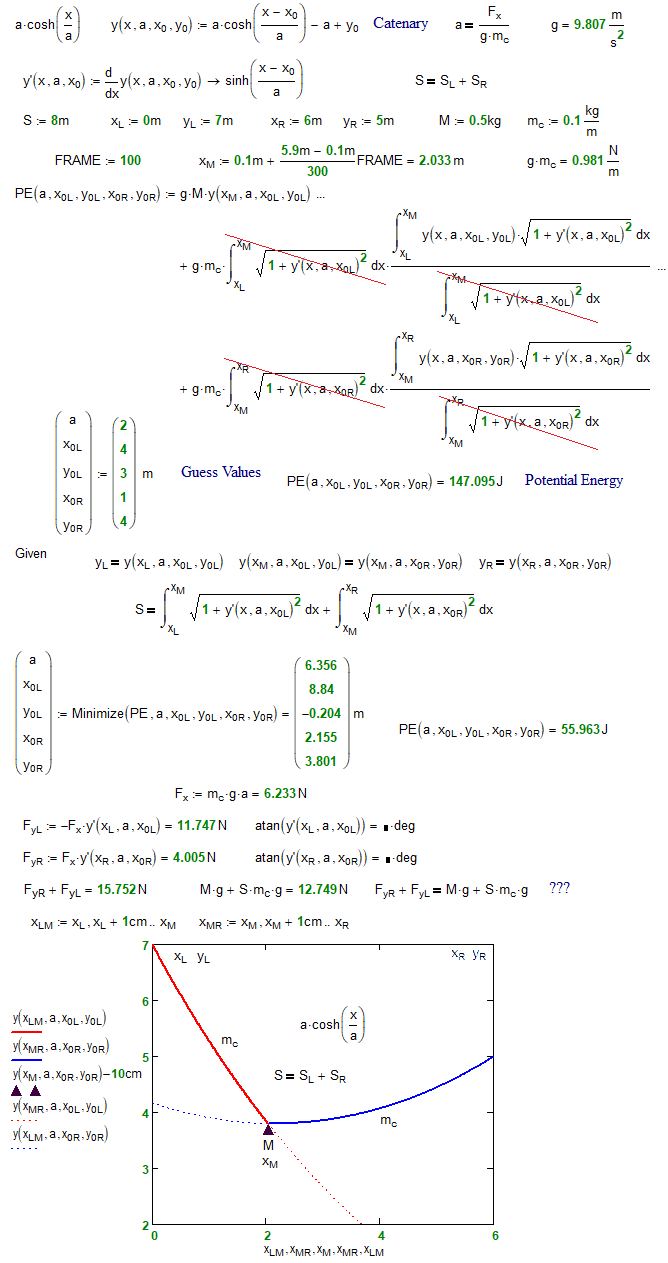Форум SMath SMath Studio Questions Catenary with mass 1 страниц (1 вхождений) Catenary with mass - How we can solve it in SMath - Сообщения К последнему сообщению #1 Опубликовано: 10.12.2025 06:22:25 Valery Ochkov 66 сообщений из 672 понравились пользователям. Группа: User Is the model correct? is a.L equal a.R? Can we insert the 5-th equation an use the Find/Roots function?Why the Forces calculation is not correct?cable-car.xmcd (122,9 КиБ) скачан 328 раз(а). Отредактировано 10.12.2025 09:58:47 1 страниц (1 вхождений) Новые сообщения Нет новых сообщений