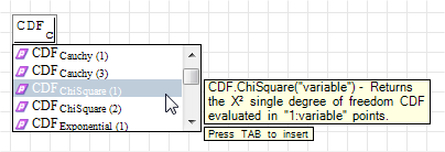 ICDF.ChiSquare("1:variable", "2:number") - Returns the single degree of freedom Χ² quantile function evaluated for "1:variable" probability values ∈[0;1], using assigned "2:number" degrees of freedom.