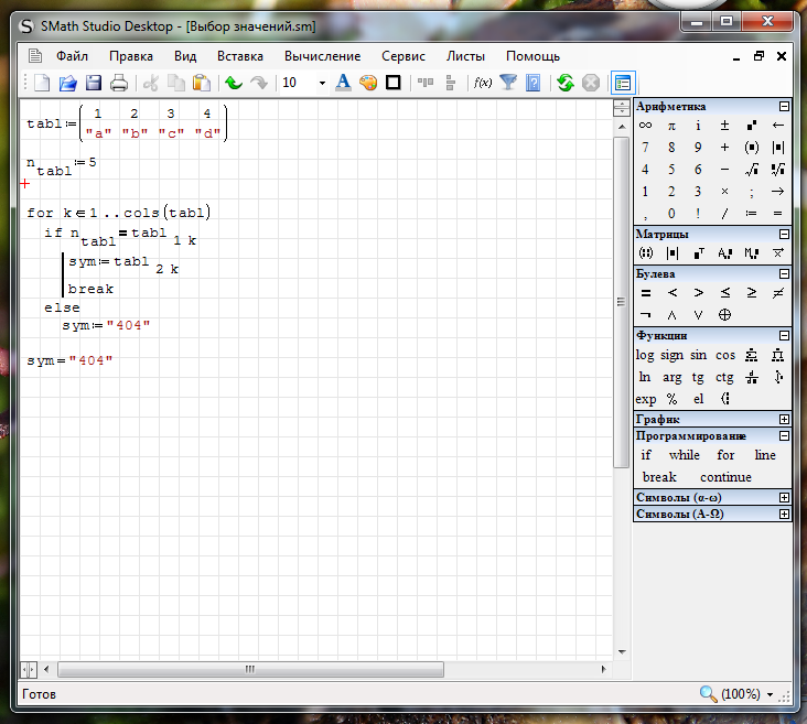 Форум SMath SMath Studio Вопросы по использованию Выбор значения из таблицы 1 страниц (2 вхождений) Выбор значения из таблицы - Выбор значения из 2ой строки по значению из 1ой - Сообщения К последнему сообщению #1 Опубликовано: 10.02.2015 01:00:15 mbdj 0 сообщений из 5 понравились пользователям. Группа: User Уважаемые форумачане, хочу задать вопрос.Как выбрать из 2ой строки таблицы "табл" текст или число "буква_строки_2", на основание совпадения введенного числа "число_строки_1" с одним из чисел 1ой строки таблицы.Привожу пример #2 Опубликовано: 05.04.2015 13:45:43 LitvincevYV 1 сообщений из 7 понравились пользователям. Группа: User Если автору еще пригодится (или кому другому) 1 страниц (2 вхождений) Новые сообщения Нет новых сообщений